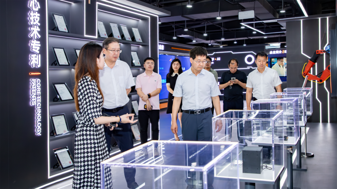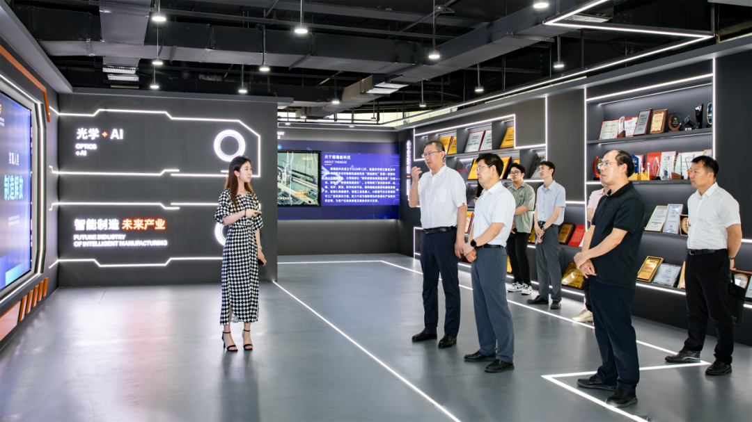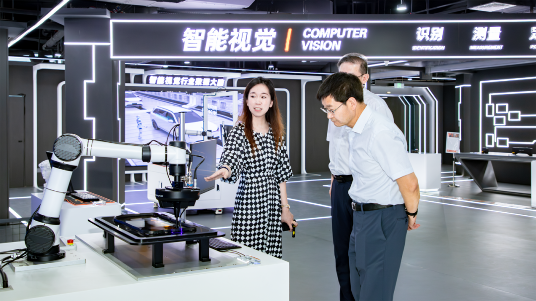 在中科摇橹船智能视觉展厅,张继红一行对公司自主研发的核心器部件和装备进行了实地查看,了解了公司产品在新能源、半导体等行业的应用情况。