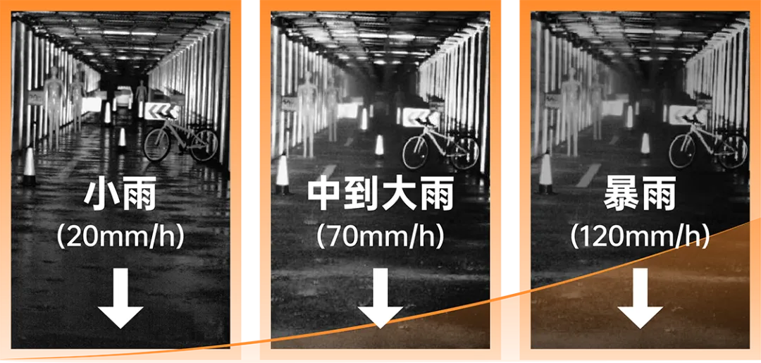 随后的暴雨模拟环节,可视化激光雷达相机的感知性能同样未受降雨强度影响,普通摄像头则被雨雾遮盖。