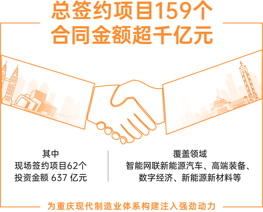据悉,大会期间,全市共签约项目159个,合同投资金额突破千亿元,涵盖智能网联新能源汽车、高端装备、数字经济等多个战略领域,为重庆“33618”现代制造业集群体系建设注入强劲动能。