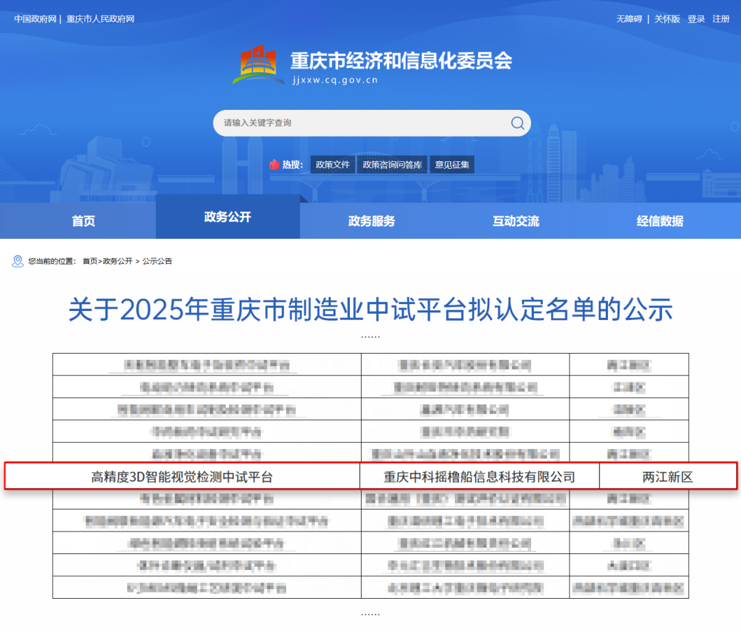 “2025年重庆市制造业中试平台”由重庆市经信委组织评审。中科摇橹船的“高精度3D智能视觉检测中试平台”从众多申报单位中脱颖而出,进入全市仅31家的认定名单。