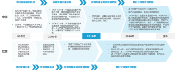 机器视觉发展历程四个阶段:理论发展起步阶段、应用发展迅速阶段、应用与理论同步发展阶段、各行业深度应用阶段。当前中国处于第四阶段。